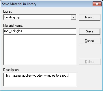 To add a material to an existing property library you would select it from the "Library" list, then type in a material name and description and choose Save. To create a new library you would choose New, and provide the file name and location.